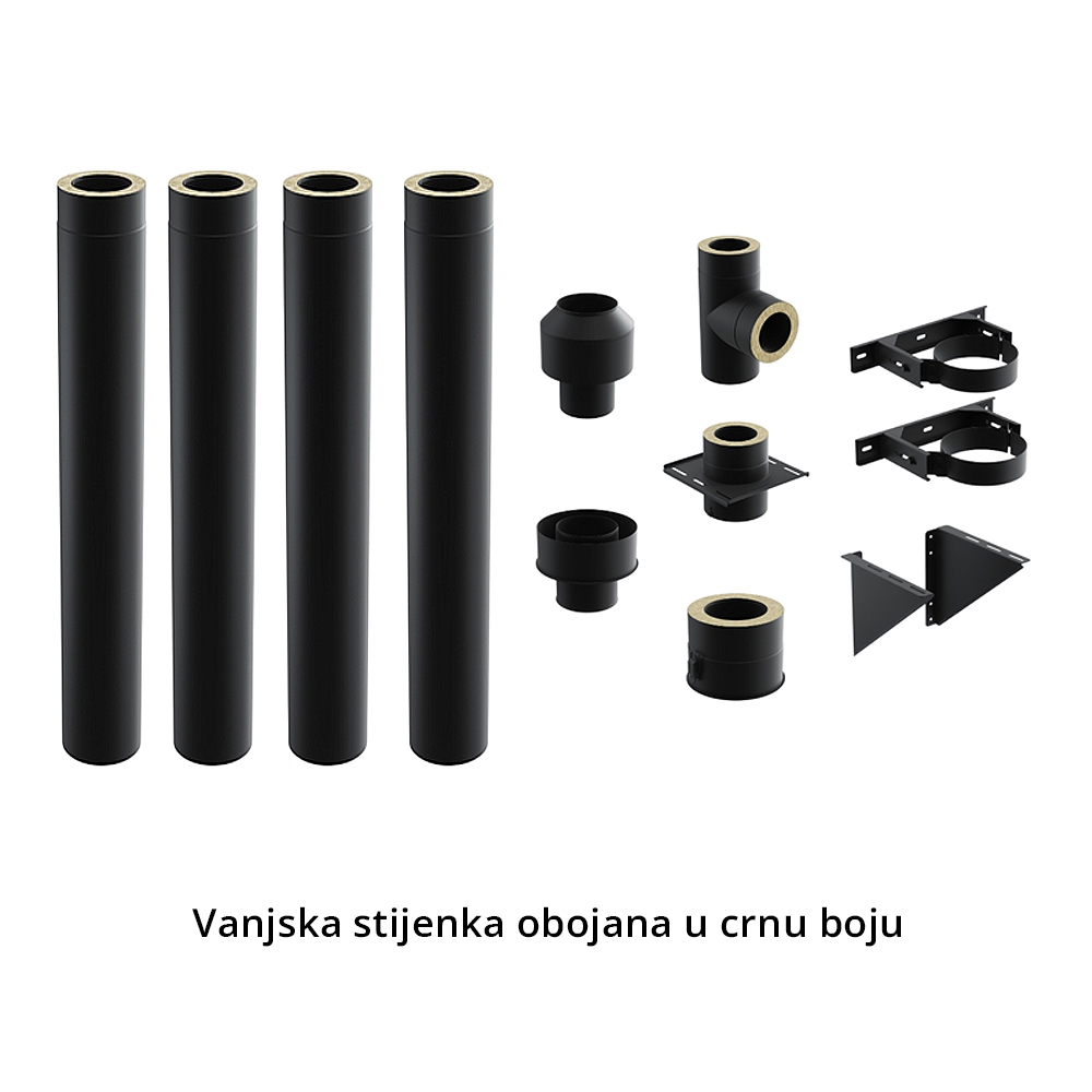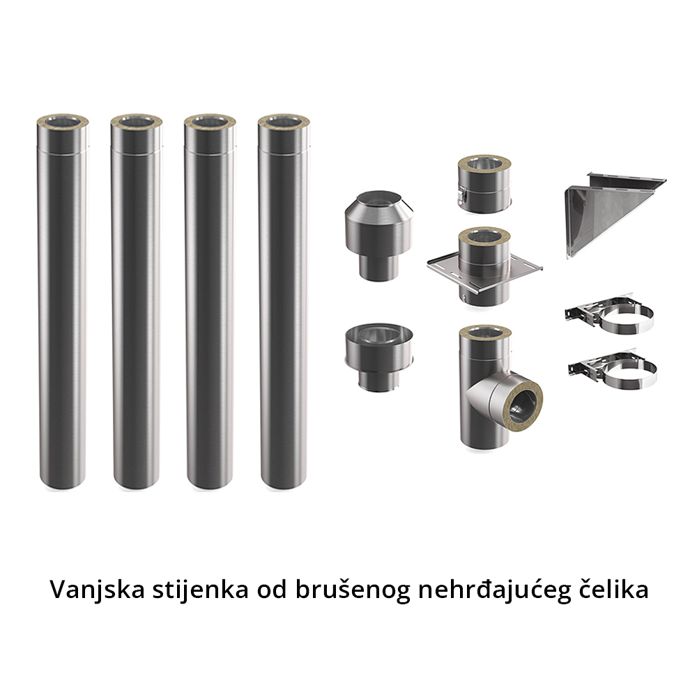 Vanjska stijenka izrađena je od nehrđajućeg čelika 1.4301-4N, dostupna u brušenoj ili crno lakiranoj izvedbi (RAL9005). Unutrašnjost dimnjaka obložena je 30 mm debelim slojem mineralne vune, koja pruža izvanrednu toplinsku izolaciju i minimizira toplinske gubitke.