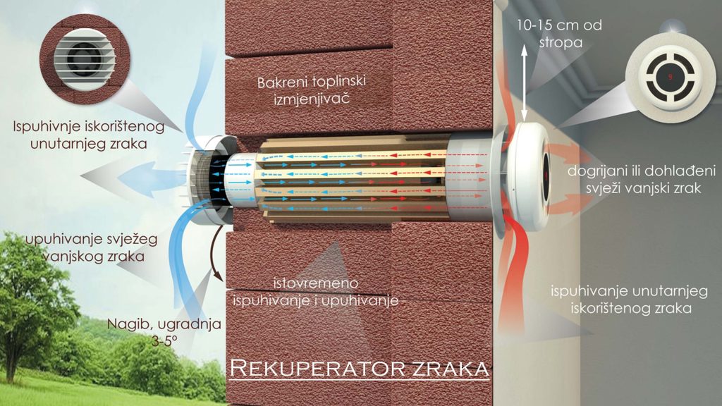 Za pravilnu ventilaciju i maksimalnu učinkovitost grijanja, preporučuje se ugradnja rekuperatora koji može raditi u stalnom režimu ili se automatski uključivati prema potrebi.
