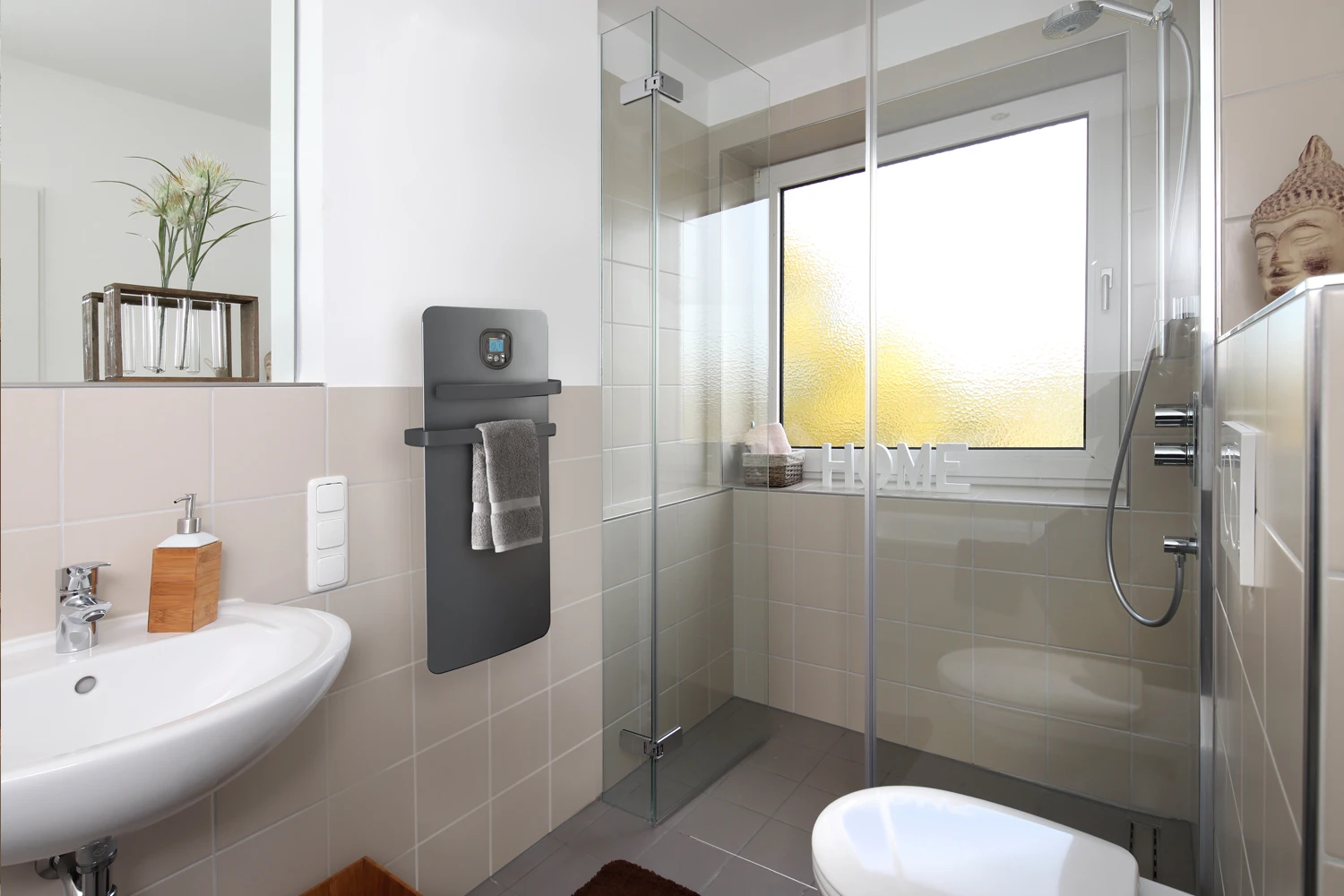 Anuri kupaonski radijator, proizveden u Francuskoj, spaja elegantan dizajn s kompaktnim dimenzijama, savršeno se uklapajući u svaku kupaonicu. Njegov jednodijelni aluminijski grijač brzo zagrijava prednju ploču, pružajući ravnomjernu i ugodnu toplinu. Za osnovno grijanje koristi snagu od 500 W, dok integrirani ventilator s dodatnih 700 W omogućuje brzo podizanje temperature i ubrzano sušenje ručnika kada je to potrebno. BOOST funkcija pruža intenzivno grijanje snagom od 700 W tijekom maksimalno 2 sata; nakon tog razdoblja, funkciju je potrebno ponovno aktivirati. Ventilator je opremljen filterom za prašinu, osiguravajući čist i svjež zrak u prostoriji.