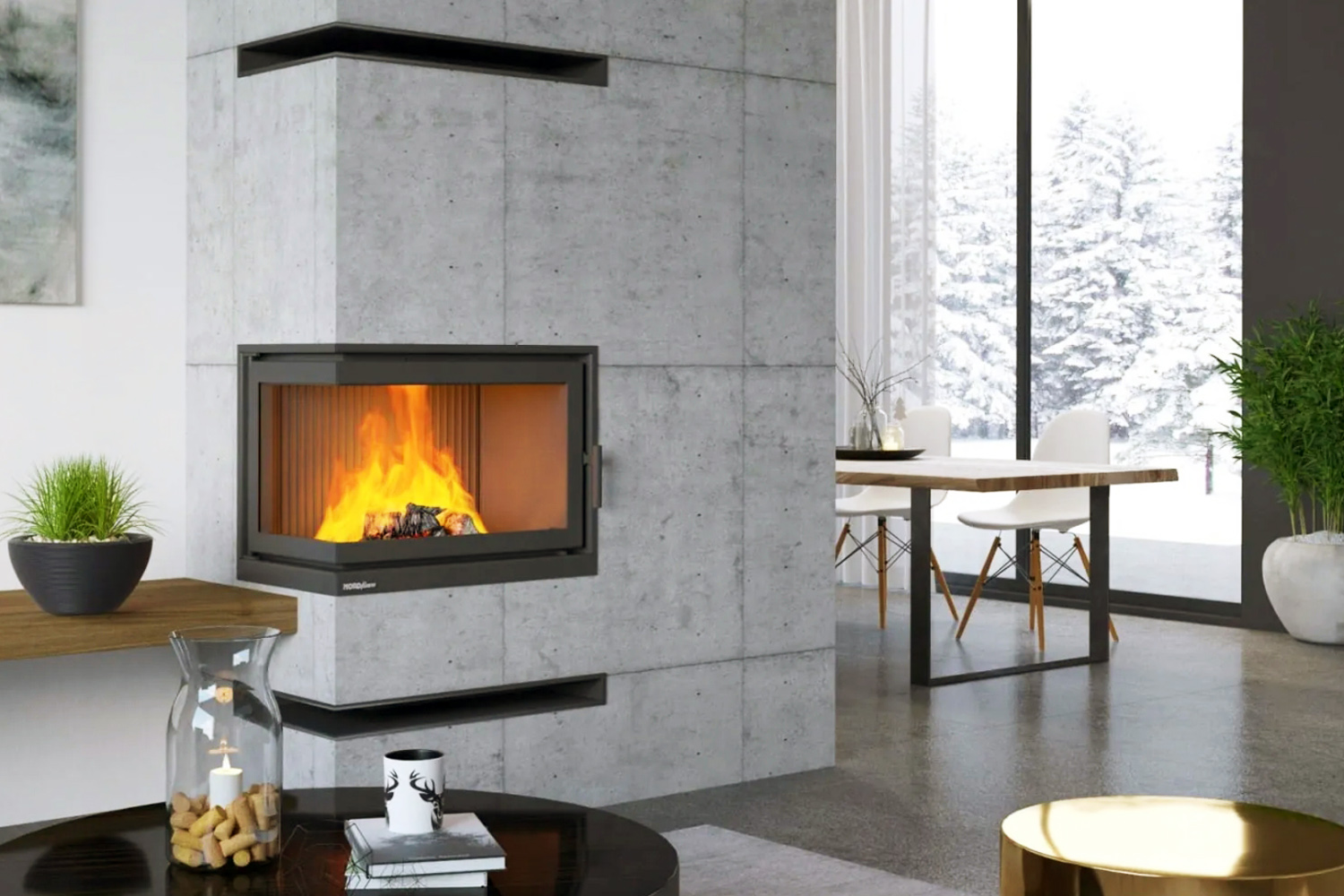 Bočno staklo – Kutna konstrukcija kamina omogućuje nesmetan pogled na vatru s dvije strane, pružajući estetski užitak i toplu atmosferu. Ovo je idealno rješenje za prostorije gdje želite uštedjeti na prostoru, a istovremeno zadržati vizualni doživljaj vatre iz više kutova. Savršeno se uklapa u spojene prostorije poput blagovaonice i dnevnog boravka, omogućujući uživanje u toplini i ljepoti plamena iz različitih perspektiva.