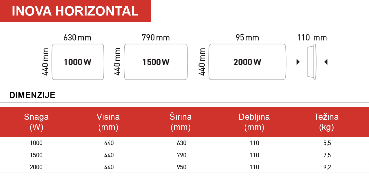 - Horizontalni modeli: 1000W, 1500W, 2000W