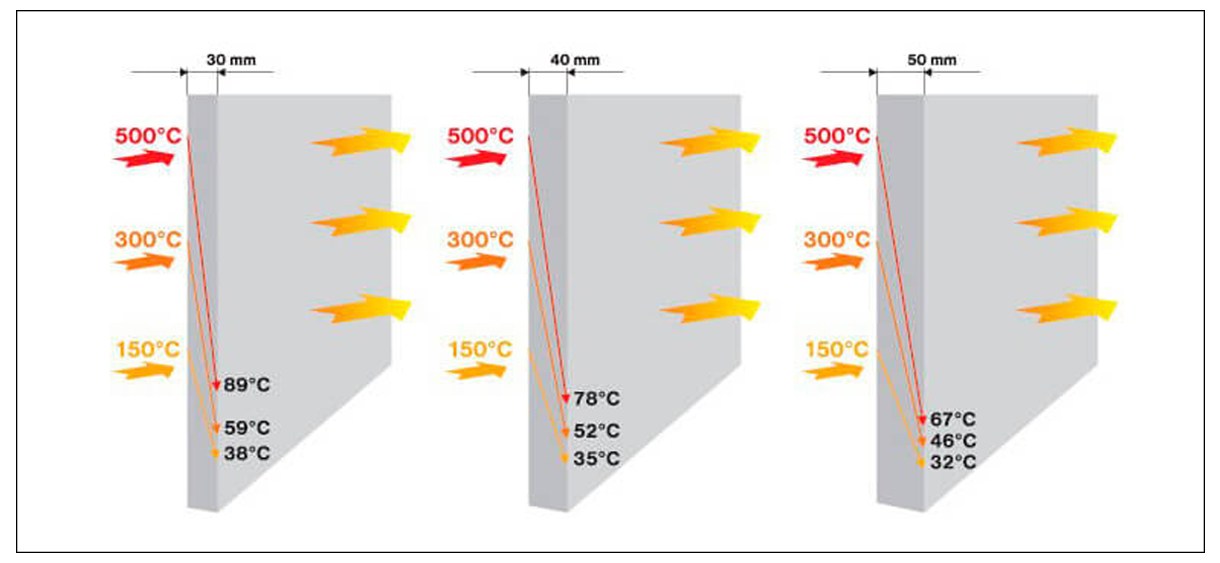 Na slici ispod možete vidjeti razliku u prijenosu topline kalcij-silikatnih ploča ovisno o njihovoj debljini. Jasna je razlika u korist ploča debljine 50 mm.