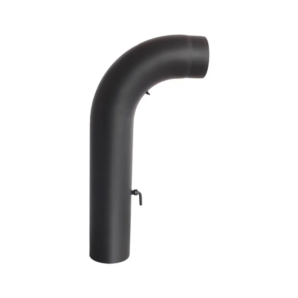 Savijeno koljeno visoko-kratko s revizijskom i dimnjačkom zaklopkom koristi se kao estetski spoj za ispušne plinove iz kamina i uređaja za grijanje koji koriste kruta goriva, poput drva ili briketa. Dizajnirano za rad u sustavima bez kondenzacije.