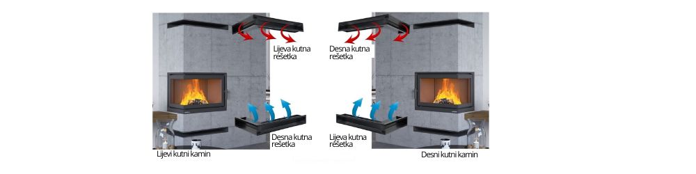 Otvorene zračne rešetke treba postaviti iznad kaminske ložište s otvorima okrenutim prema dolje (za ispust toplog zraka u prostoriju) ili ispod ložišta s otvorima okrenutim prema gore (za dovod konvekcijskog zraka).
