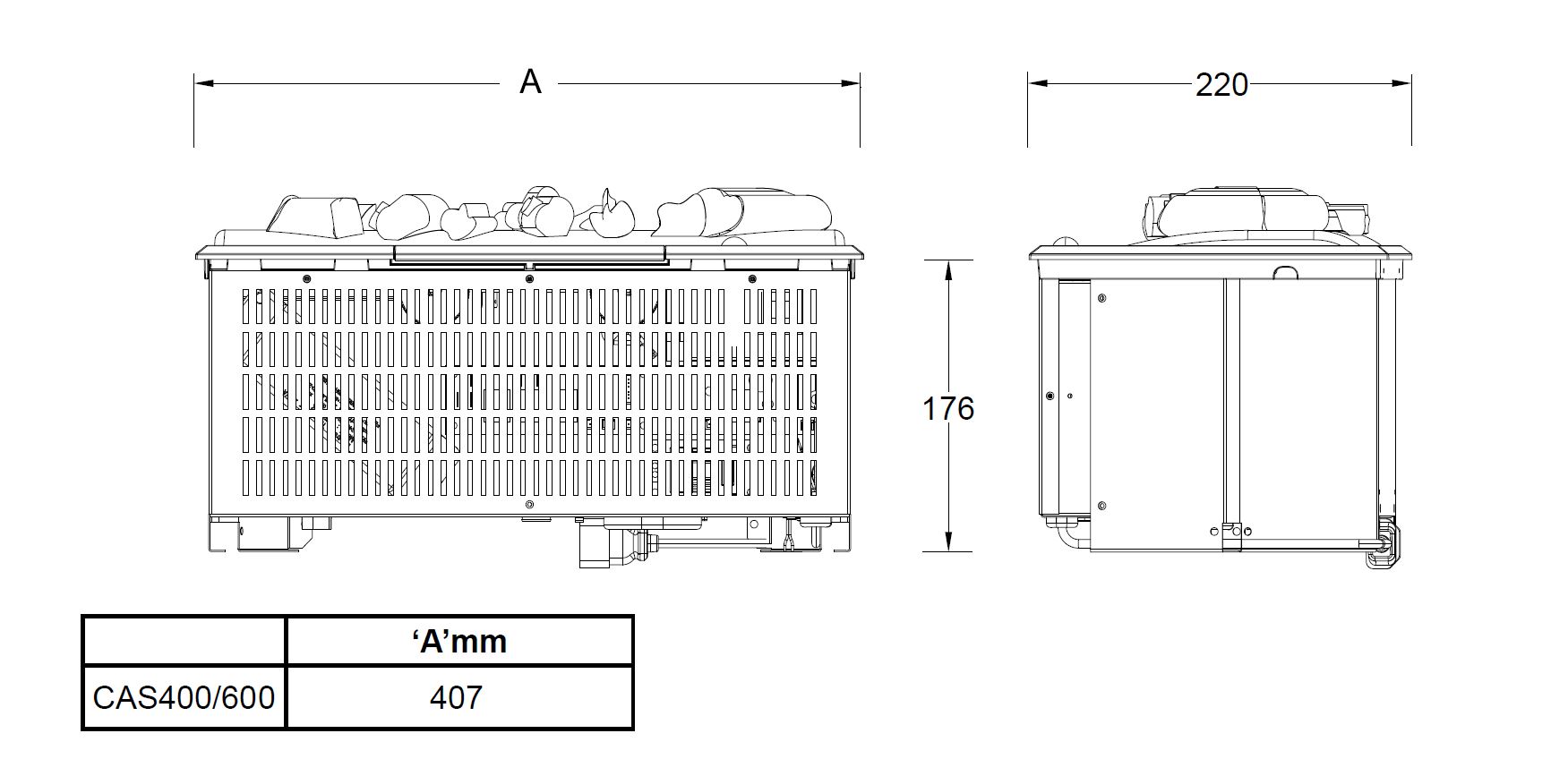 Za optimalan rad modela Dimplex Cassette 400/600 preporučuje se osigurati otvor za dovod zraka površine 100 cm². Ova ventilacija omogućava pravilno funkcioniranje uređaja i sprječava nakupljanje vlage unutar kamina.