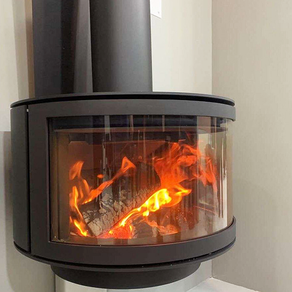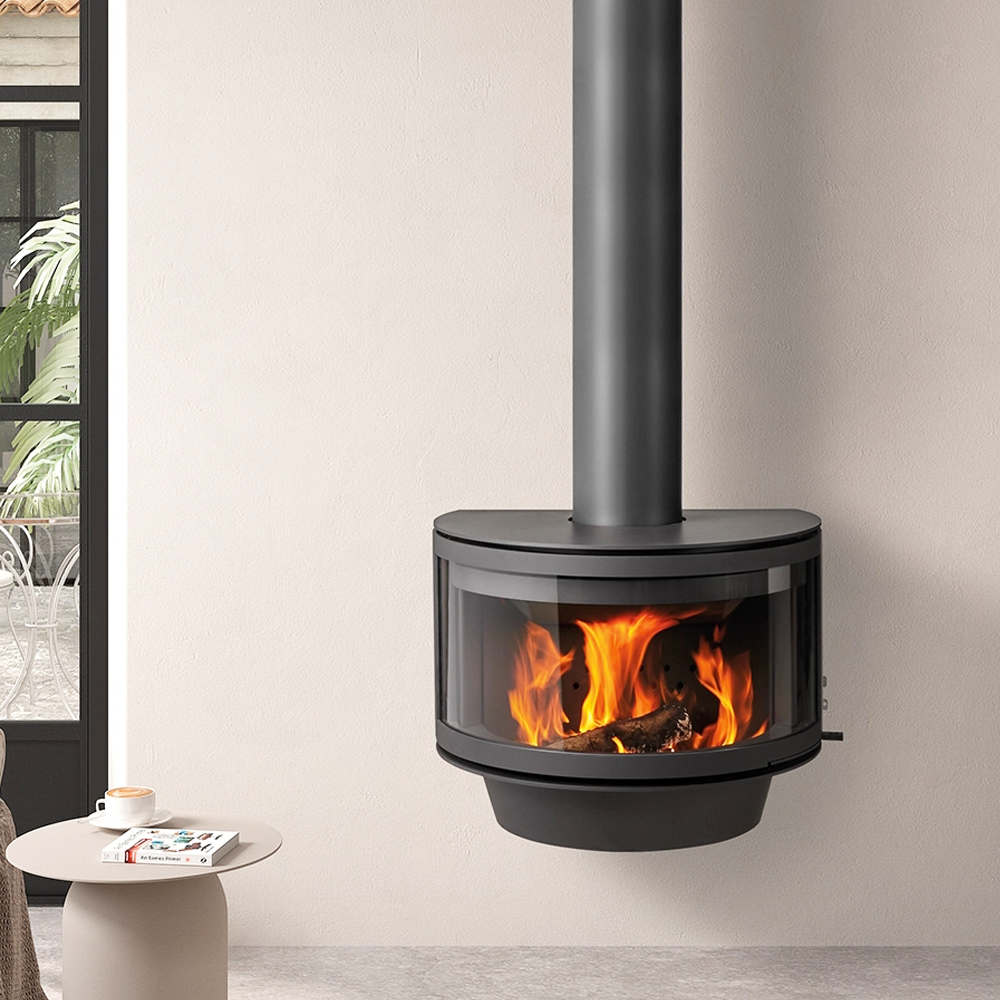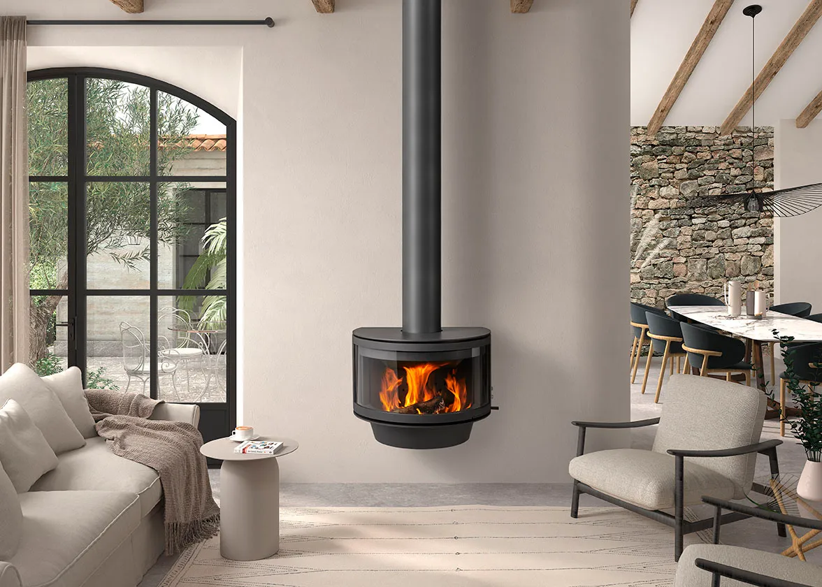 Ronde Frontal je sofisticirani viseći kamin na drva, stvoren da unese eleganciju i toplinu u svaki prostor. Njegova elegantna crna boja u kombinaciji s polukružnim vitrokeramičkim staklom pruža neometan pogled na vatru, stvarajući jedinstven vizualni i funkcionalni doživljaj.