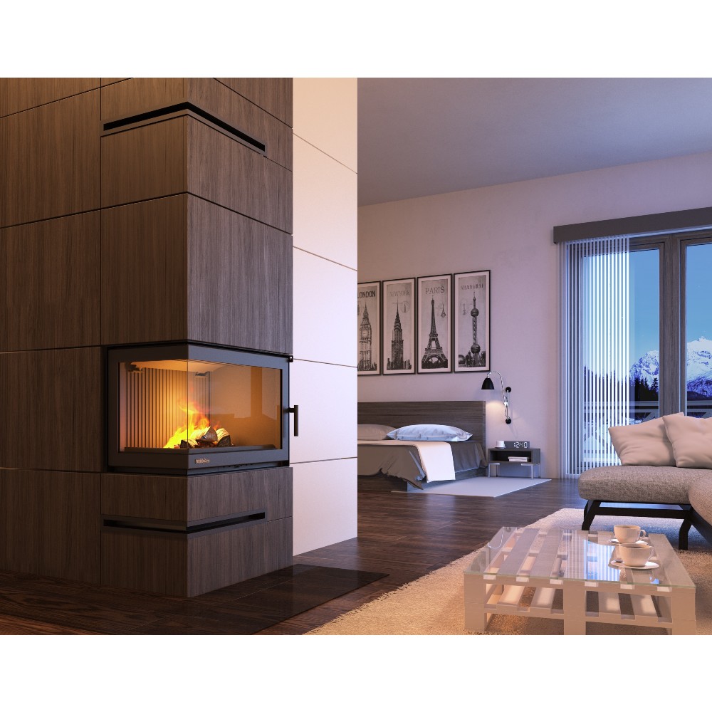 Bočno staklo – nesmetan pogled na vatru s dvije strane zahvaljujući kutnoj konstrukciji kamina. Savršeno za prostorije u kojima ne želite zauzimati puno prostora, ali želite imati pogled na vatru sa svih strana, npr. iz blagovaonice i dnevnog boravka, ako su te dvije prostorije spojene.