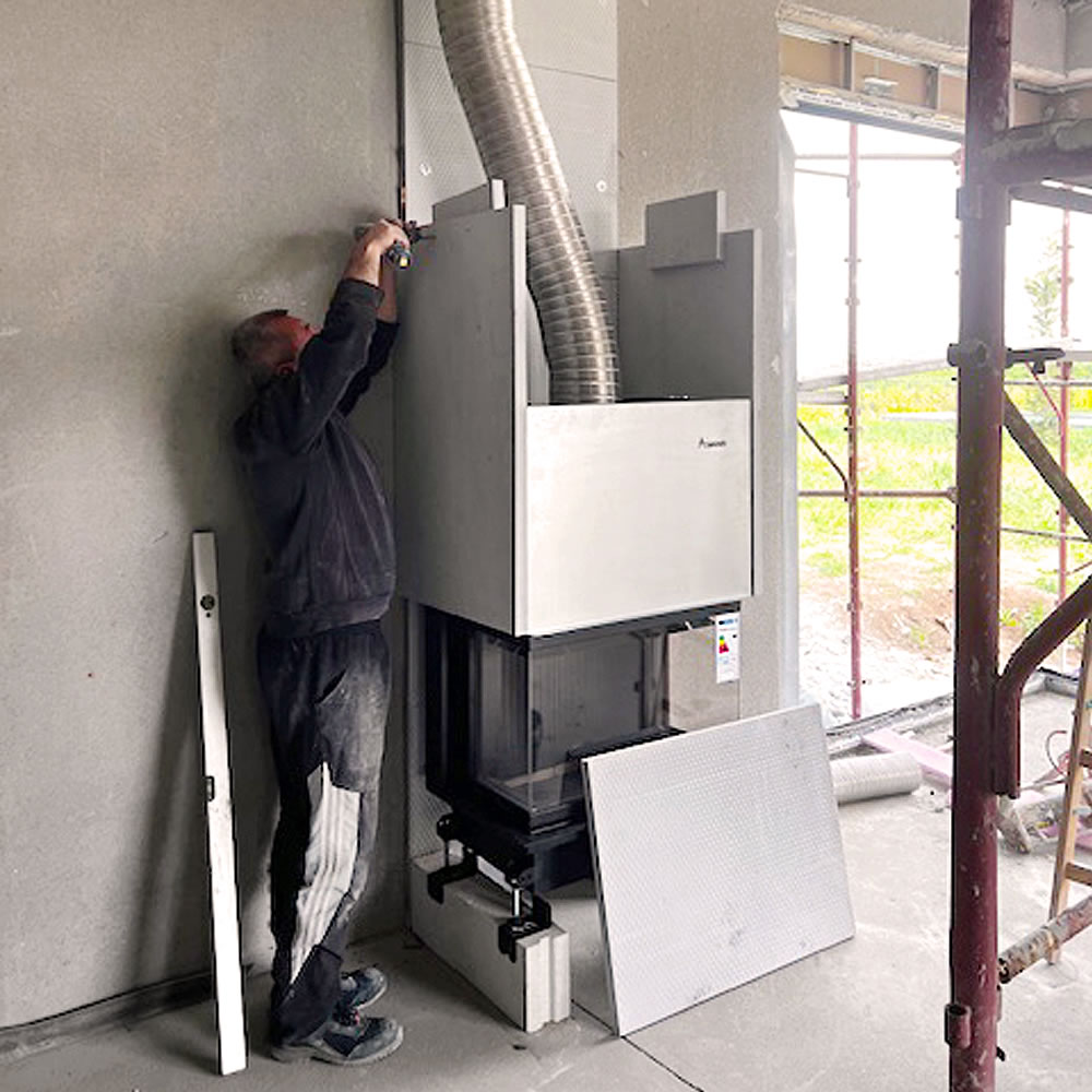 Nakon što je kamin precizno pozicioniran, spajamo ga na dimnjak te izrađujemo oblogu. Na oblogu nanosimo ljepilo i staklokeramičku mrežicu, nakon čega postavljamo kaminske rešetke za cirkulaciju zraka.